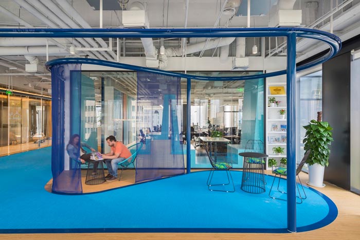 旅游公司辦公室活動隔斷設(shè)計:設(shè)計師在辦公室設(shè)計的時候,幾乎所有的隔斷都是可以移動的,也就是說需要的時候隨時可以組成一個空間,但是在不需要的時候,玻璃隔斷也會打開,將所有空間連接起來。
