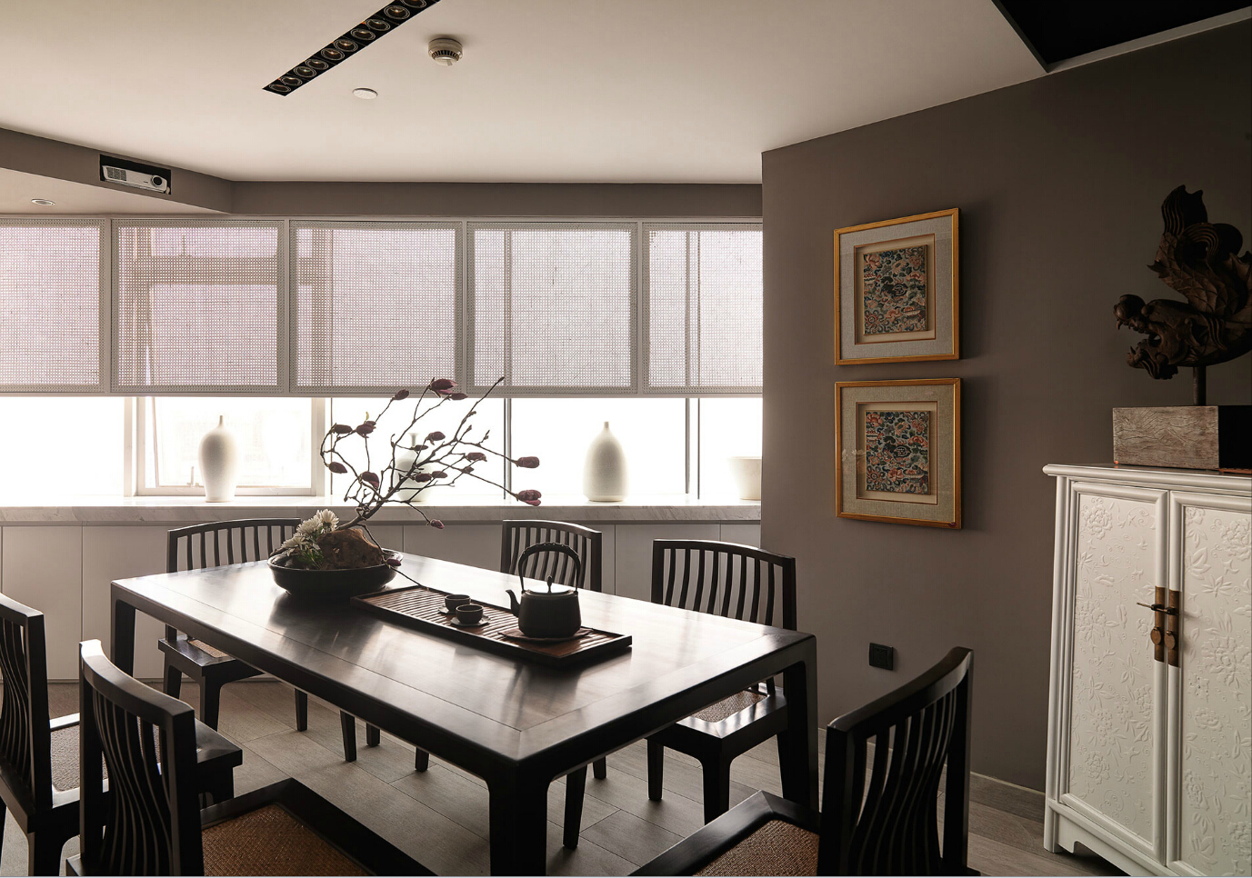 中式風(fēng)格的辦公室需要充足的陽光,因此通常會在窗戶附近設(shè)置明亮的照明燈具。此外,還可以通過燈光來增強(qiáng)整個空間的層次感和深度。